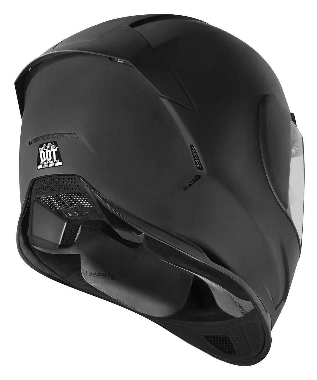 The modern riding position of higher rear sets and lower clip-ons has dramatically altered how a rider interacts with the modern motorcycle. Compressed into an ever more compact shape, the rider’s head positioning requires an increased angle to maintain visibility and stability. The Icon Airframe Pro Helmet has been built on this singular design focus which allows Icon to realize opportunities to decrease drag and weight by sculpting the traditional neckline to avoid jacket or suit interference. The Icon Airframe Helmet’s aggressive geometry increases the line of sight while improving aerodynamic attitude in a fully-tucked riding posture.