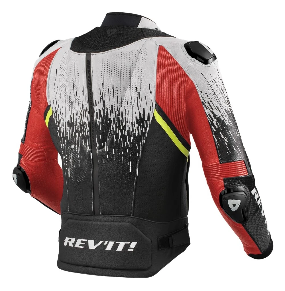 Aggressive style. Aggressive graphics. Aggressive performance. The Quantum 2 Pro Air Jacket is the REV’IT! leather track jacket par excellence. Taking it from the top, PWR|Fuse Airmesh technology – unique to the Quantum 2 Pro Air – is applied to the top panel of the speedhump and across the shoulders. Effectively, this mesh creates an oversized intake for air when the rider is in a tuck. Matte Monaco cowhide forms the main structure. Stretch PWR|Shell textile panels along the inner arms create a fit that is body hugging and dynamic. Comfort supports focus. At the wrist and collar, inserts of neoprene finish the meticulous selection of materials and help further unite the jacket and rider.Â