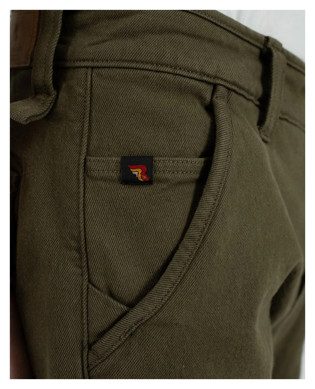The Riding Culture Cargo Pants are constructed with a single layer material, making them feel like everyday pants. Abrasion resistant fibers woven into the fabric make the jeans completely CE rated, while still being stylish and comfortable. Pairing together Polyamide and Dyneema fibers make the pants stronger than steel with a very high melting point, transmitting very little heat in the event of a slide. The stylish olive cargo pants you won’t want to take off even after riding.